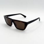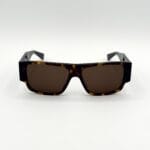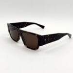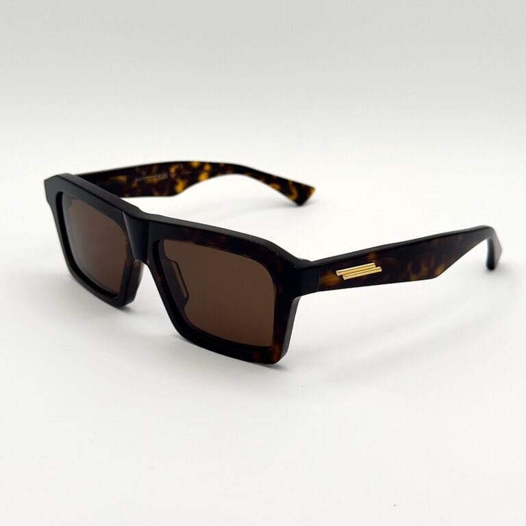 Occhiale da sole Bottega Veneta dalla forma rettangolare, montatura in acetato, colore havana, logo oro in rilievo in entrambe le aste, lenti marroni