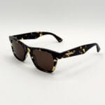 Occhiale da sole Bust Out dalla forma rettangolare con doppio ponte, montatura in acetato, colore tartaruga, cerniere oro, lenti sfumate verdi.
