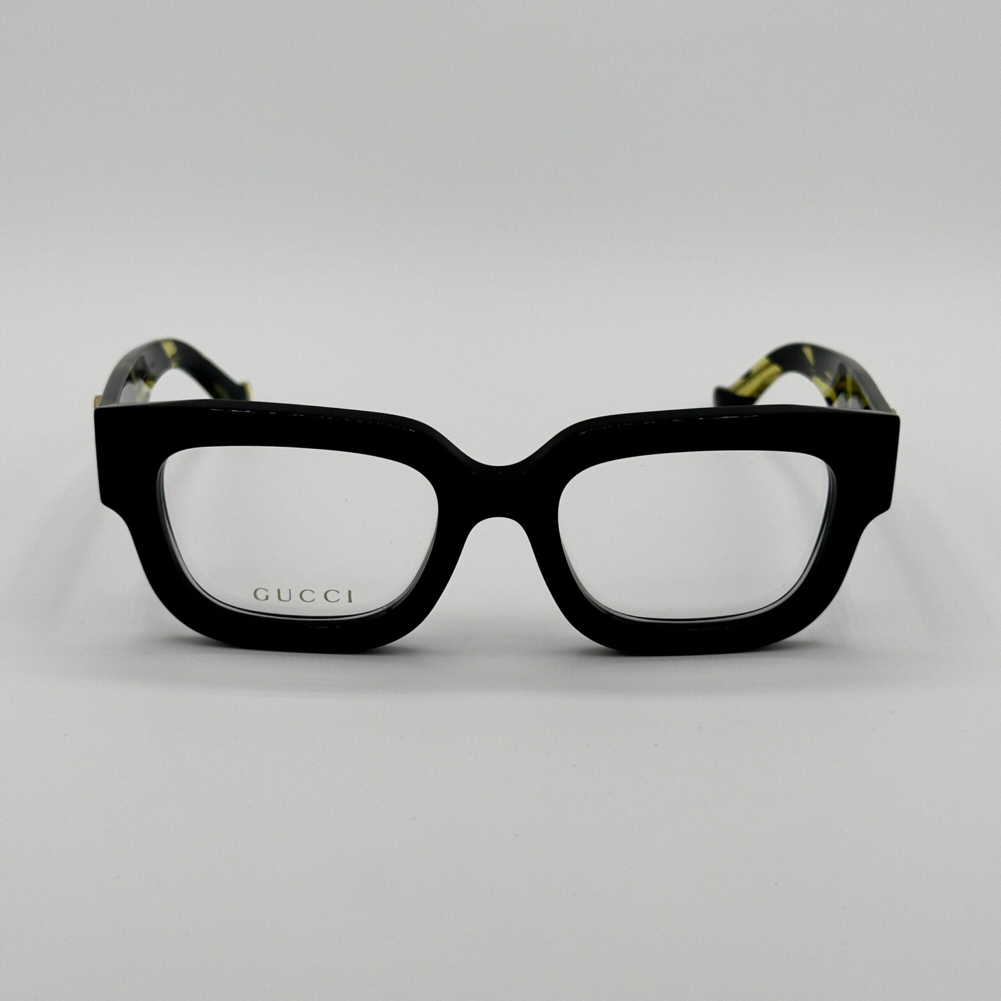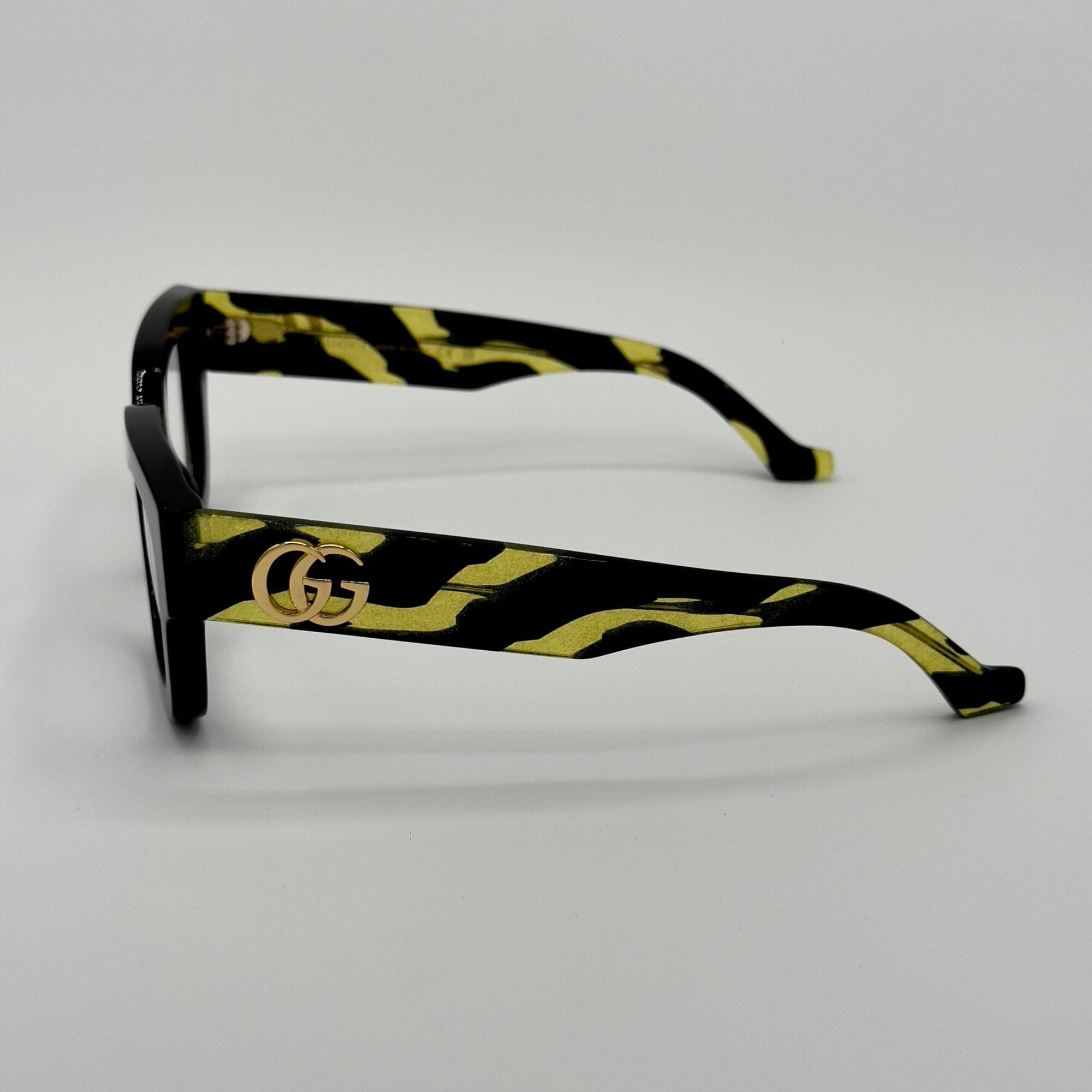 Occhiale da vista Gucci dalla forma squadrata, montatura in acetato, colore nero nel frontale, aste nere e gialle brillantinate, logo oro in rilievo in entrambe le aste