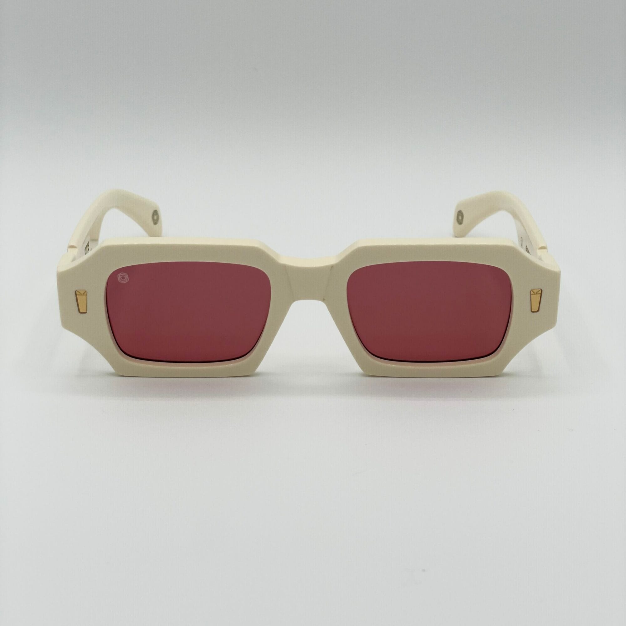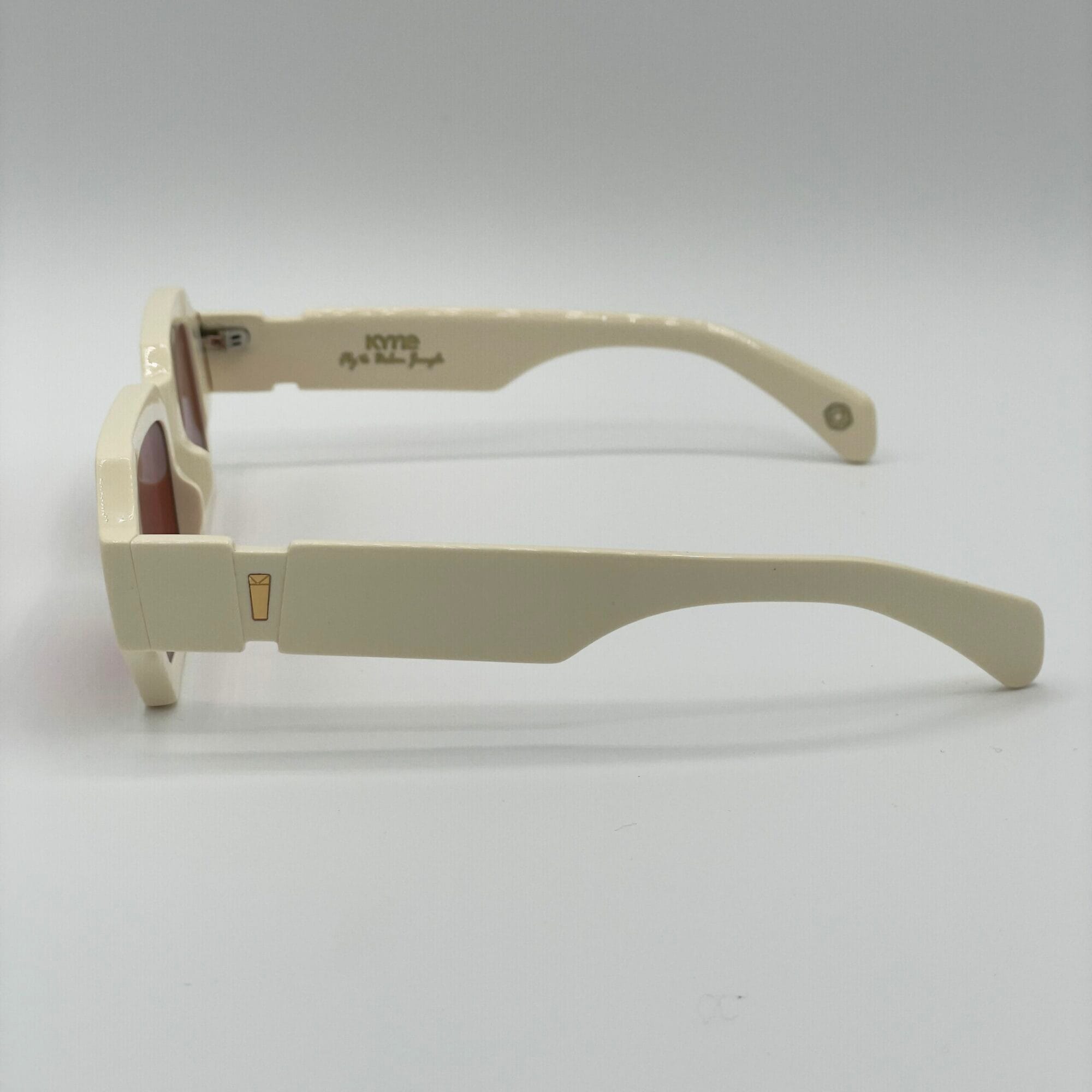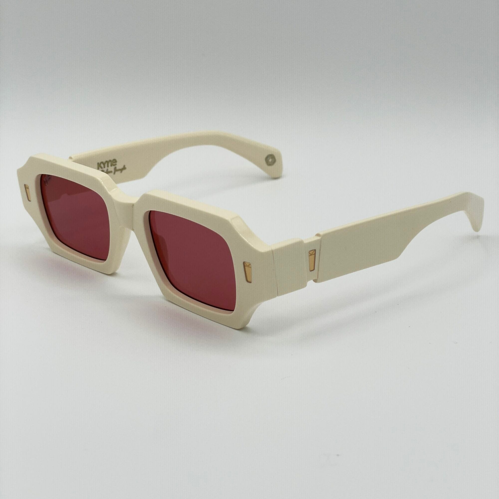 Occhiale da sole Kyme dalla forma rettangolare, montatura in acetato, colore panna, aste con logo oro, lenti fucsia